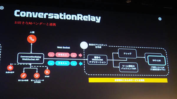 同社でTechnical Program Managerを務める遠藤聡氏は、Twilioでは顧客とのコミュニケーションチャネル、AI、データという“3つの柱”を連携させた「次世代の顧客体験」を実現していくと説明する。Twilioでは、同社のCPaaSプラットフォームの中で、音声通話をテキスト化し、対話型AIアプリケーションに中継する「Twilio ConversationRelay」という機能を提供している。
