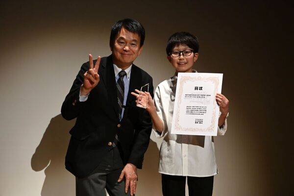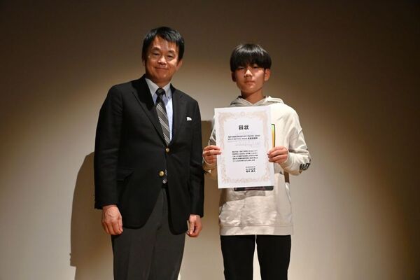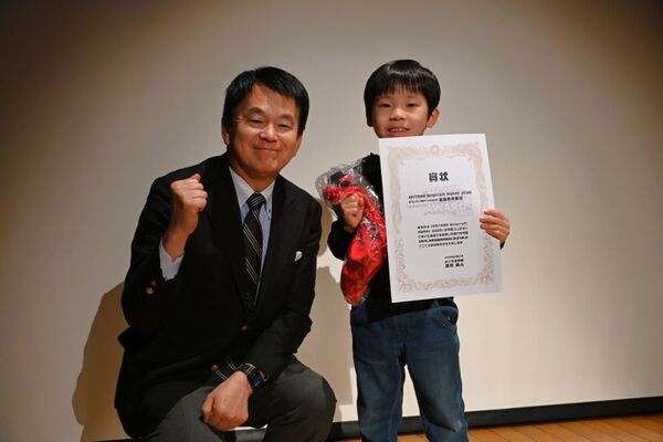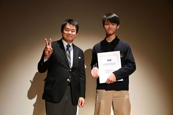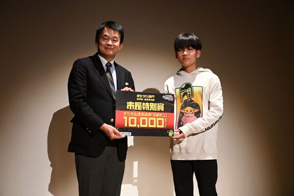 まずは審査員特別賞の発表。選ばれたのは「スーパーアドベンチャーさいたまURAWAワールド」を制作した峯尾駿さんです。プレゼンターの清水市長から賞状と副賞のTシャツを授与され、「うれしいです」と笑顔で喜びを語っていました。