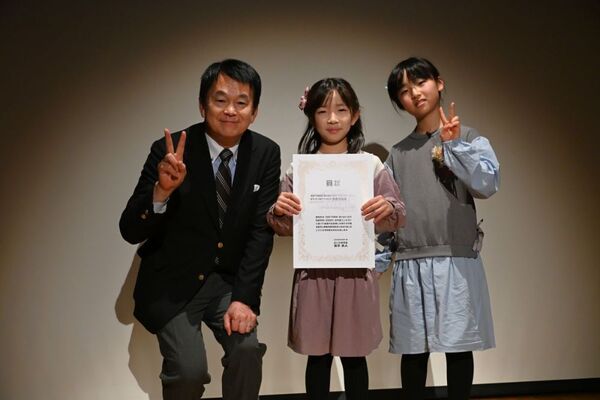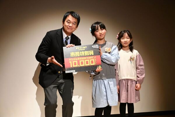 小学生の部の市長特別賞は、「新都心のあらたな未来」を制作した水上結衣花さんと井口青葉さんが受賞。同じく副賞として「たまポン」1万ポイントが贈呈されました。「結果発表のときに「受賞できますように」と神様にお願いをしていました。本当に受賞できて、とてもうれしいです」と笑顔いっぱいです。