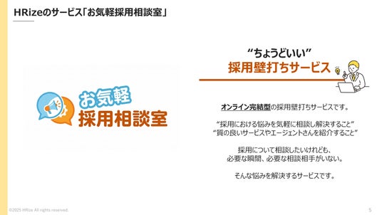 株式会社HRize(読み:エイチアライズ、代表取締役社長:岩見直哉、以下「HRize」)は、”勝ちたい企業に人事戦略を届ける”HR Strategic Campanyとして、採用に悩めるお客様の専門家への相談ハードルをとことん下げた新サービス”お気軽採用相談室”をリリースしましたことをご報告いたします。