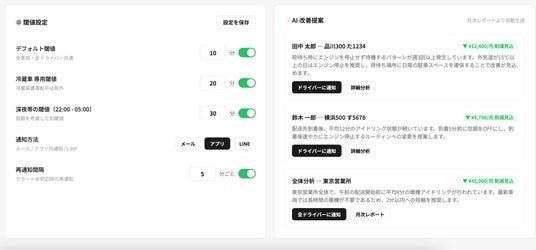 車両ごと・ドライバーごとにアイドリング時間、燃料消費量、走行効率を自動算出し、改善余地の大きいドライバーに対して具体的なアクション提案を生成します。月次の改善レポートも自動で出力されます。
