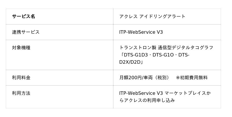 ティーティス合同会社(本社:東京都渋谷区、代表:高頭博志)は本日、同社の車載器あとづけAI「アクレス」において、株式会社トランストロンが提供する「ITP-WebService V3(以下 ITP-web)」のテレマティクスデータと連携した「アイドリングアラート機能」の提供を開始したことを発表しました。