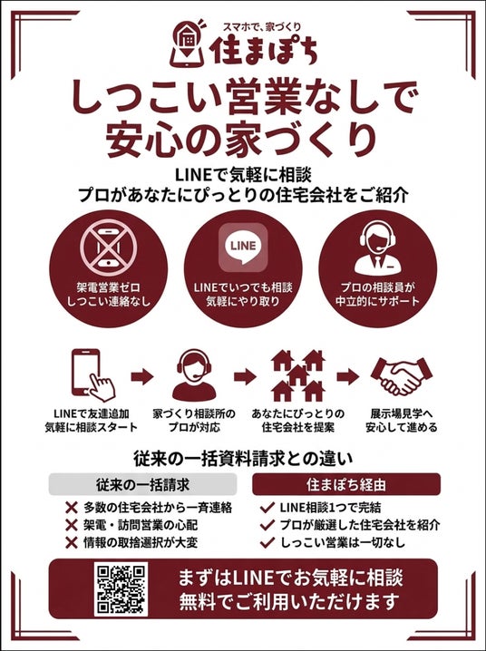 注文住宅に特化した相談窓口「家づくり相談所」を全国に90拠点以上展開する株式会社家づくり相談所は、SNSアンバサダーと広告運用を掛け合わせた次世代型集客サービス「住まぽち」において、提携住宅会社様のリスクを完全に排除した新マッチングプログラムを本格始動します。
