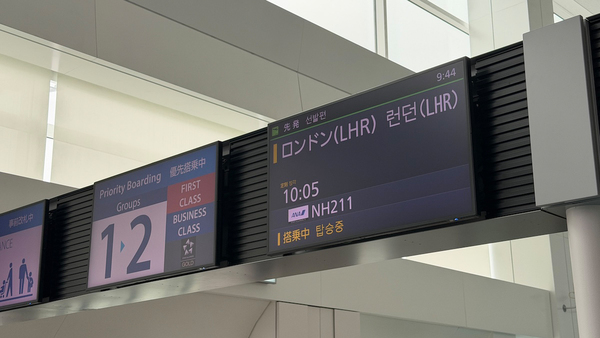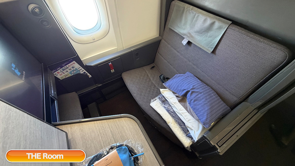 今回搭乗したのは、羽田発ロンドン行きのNH211便。機材はボーイング 777-300(ER)です。座席番号は7A。THE Room FXも同じですが、スペースを有効に活用するため前後向かい合わせの配置で、着座した7Aも進行方向とは逆の後ろ向きの席。飛行機で後ろ向きは違和感があるかなと思いましたが、離着陸がいつもと感じが違うだけで、フライト中も含めて特に違和感はありません。