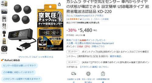 カシムラのタイヤ空気圧センサー「KD-220」がAmazonで割引対象。参考価格8,778円のところ、38%オフの5,480円で販売中。