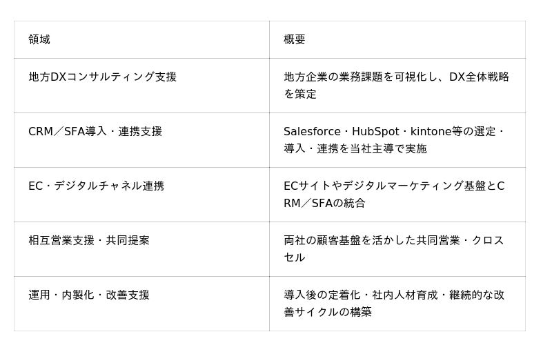 本提携により、当社が強みとするCRM/SFA(Salesforce・HubSpot・kintone等)の導入・運用支援に、Easy technology社のDXコンサルティングおよびデータ基盤構築の知見を組み合わせ、地方企業・中小事業者のDXを一気通貫で支援する体制を構築いたします。