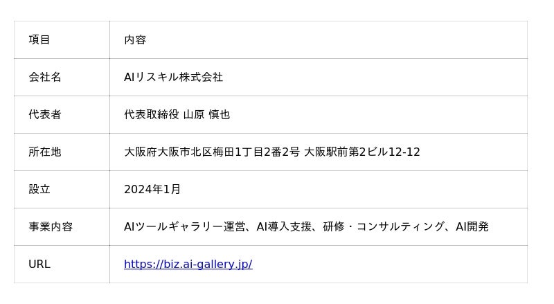 AIリスキル株式会社は、月間5万人以上が利用する生成AIプラットフォーム「AIツールギャラリー」を運営し、600以上のAIツール情報と2,000以上の記事を提供しています。企業・自治体向けの生成AI研修やAI導入支援も展開し、マーケティングと人材育成の両面からAI活用を推進しています。