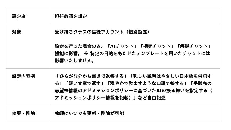 - 「長文で返してしまいがちなAIの設定を一律にせず、苦手な生徒には異なるふるまいを設定したい」