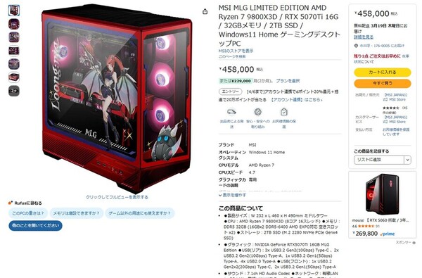 Amazon.co.jpにて、MSIのゲーミングデスクトップPC「MSI MLG LIMITED EDITION」が販売中だ。価格は45万8000円。