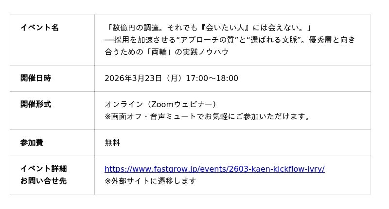 忙しい人事のためのAIスカウトサービス「Scout Base」を提供する株式会社KAEN(本社:東京都渋谷区、代表取締役:川田 勇輝)は、2026年3月23日(月)に開催されるオンラインセミナー『「数億円の調達。それでも『会いたい人』には会えない」──採用を加速させる“アプローチの質”と“選ばれる文脈”。優秀層と向き合うための「両輪」の実践ノウハウ』に登壇することをお知らせします。