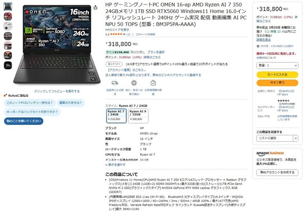 | HP ゲーミングノートPC OMEN 16-ap AMD Ryzen AI 7 350 24GBメモリ 1TB SSD RTX5060 Windows11 Home 16.0インチ リフレッシュレート 240Hz ゲーム実況 配信 動画編集 AI PC NPU 50 TOPS (型番:BM3P5PA-AAAA) |
