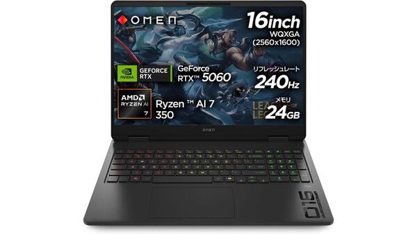 本製品は、AMD「Ryzen AI 7 350」とNVIDIA「GeForce RTX 5060 Laptop GPU」を搭載する16型ゲーミングノートPC。メモリーは24GB(12GB×2、DDR5-5600)、ストレージは1TB M.2 SSD、解像度はWQXGA(2560×1600ドット)、リフレッシュレートは240Hz、OSはWindows 11 Homeなどとなっている。