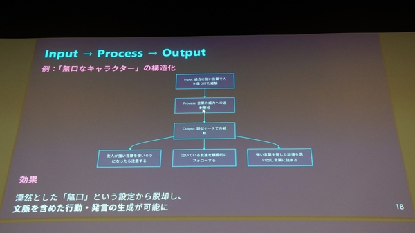 そこでAnamnesisでは、「原因(Input)→処理(Process)→出力(Output)」という因果関係をコンテキストに組み込む「キャラクターの仕様書」を作成する。これにより、無口な子の人格でいえば、「過去に強い言葉を使い、傷つけてしまった経験がある」といったトラウマや「他者が言葉で攻撃しているときにどう反応するか」といった葛藤、「類似したケースで言葉が詰まる」といった防衛機制などを実装することが可能になる。