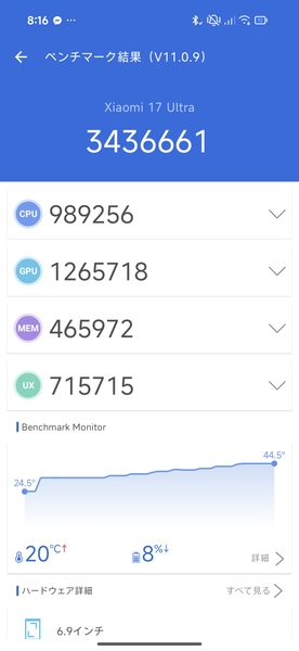 基本的に中身はベースモデルの「Xiaomi 17 Ultra」と同じなのですが、そのベースモデル自体の性能が非常に高く、CPUには最新の超高性能なチップを採用、メモリーは16GB、ストレージは1TB、バッテリー容量も6000mAhと非常に大きいものが搭載されているのです。もちろん重たい処理が必要な3Dゲームも最高設定でサクサク遊べます。
