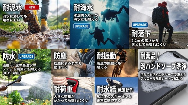 TORQUEといえば頑丈さですが、G07は信じられないレベルに進化しています。スマートフォンの丈夫さを測るテスト項目が、前モデルの29項目からなんと「37項目」へと大幅に増えました。落としたりぶつけたりするテストだけでなく、特に「泥水」に対する強さが頭おかしい(ほめ言葉)レベル!