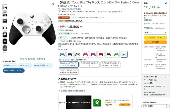 Amazon.co.jpにて、「【純正品】Xbox Elite ワイヤレス コントローラー Series 2 Core Edition (ホワイト)」が販売中だ。参考価格は2万900円だが、執筆時点では26%オフの1万5500円で購入できる(3月18日時点)。