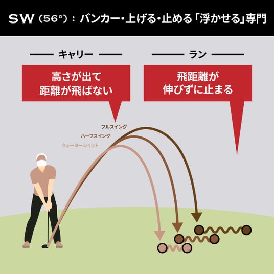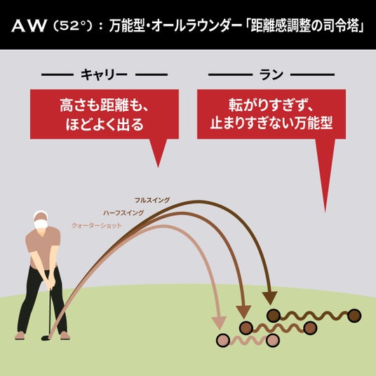 100ヤード前後のフルショット~グリーン手前からのピッチショットまで対応。ランと高さのバランスがちょうどよく、「迷ったらこれ」。
