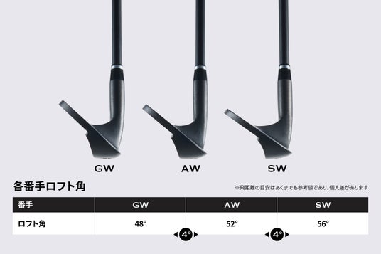 ギャップウェッジ(GW・48度)、アプローチウェッジ(AW・52度)、サンドウェッジ(SW・56度)の3番手セット