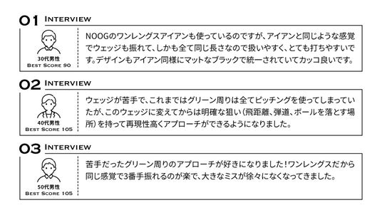 ウェッジを使用するにあたって、番手ごとの使い分けがうまくできていないという声を多くいただきました。今回、NOOGらしいウェッジを開発するにあたり、それぞれの番手で役割を明確化することにしました。