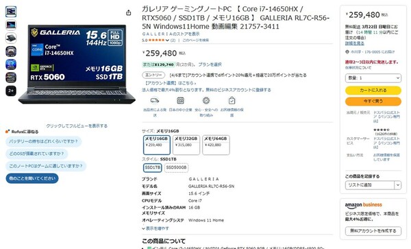 Amazon.co.jpにて、GALLERIAの15.6型ゲーミングノートPC「RL7C-R56-5N」が販売中だ。価格は25万9480円。