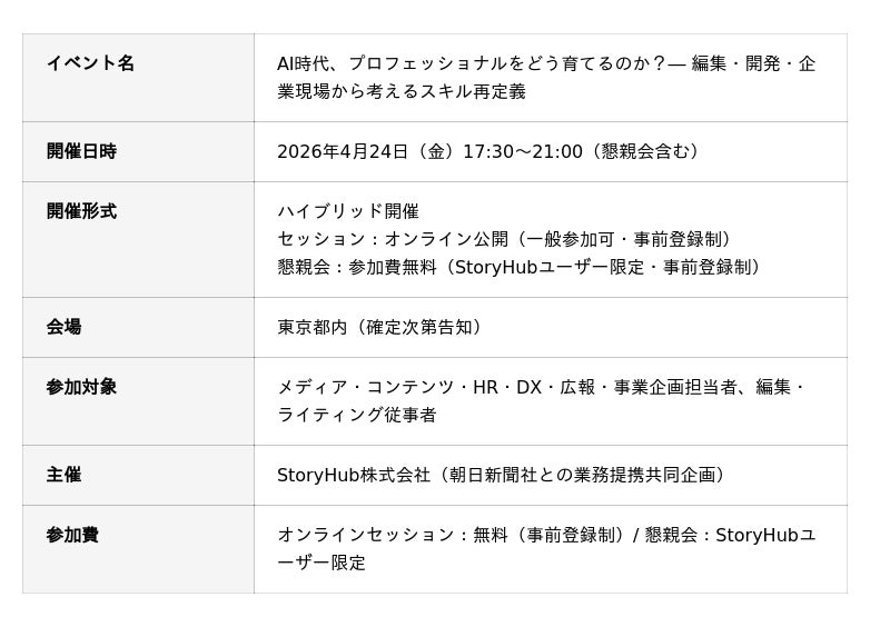 StoryHub株式会社(本社:東京都千代田区、代表取締役CEO:田島 将太、以下「当社」)が提供するオールインワンAI編集アシスタント「StoryHub(ストーリーハブ)」(以下、StoryHub)は、イベント「AI時代、プロフェッショナルをどう育てるのか?― 編集・開発・企業現場から考えるスキル再定義」を2026年4月24日(金)に開催します。