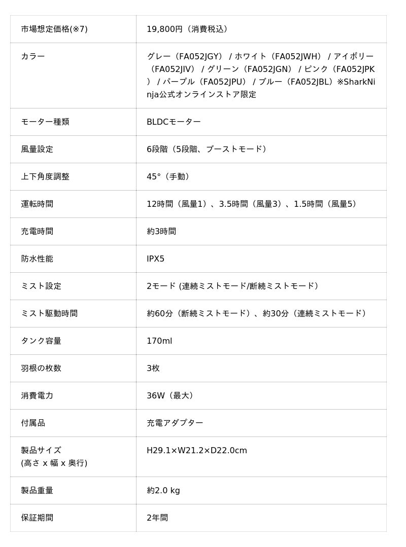 「 Shark(R) FlexBreeze HydroGo コードレスサーキュレーターファン」主要スペック