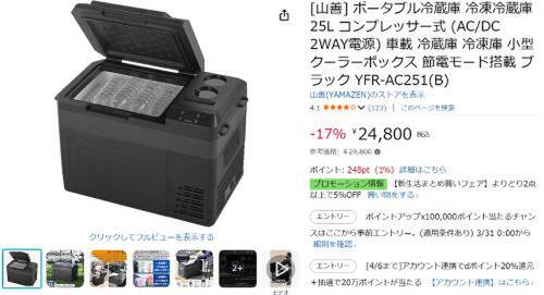 【Amazonで17%オフ】山善 ポータブル冷蔵庫「YFR-AC251(B)」をチェック!