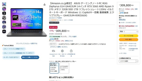 ASUS製ゲーミングノートPCが9%オフ