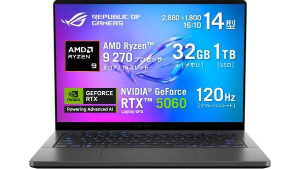 ROG Zephyrus G14 GA403UMは、AMD「Ryzen 9 270」とNVIDIA「GeForce RTX 5060」を搭載する14型の有機ELゲーミングノート。メモリーは32GB、ストレージは1TB M.2 SSD、解像度は2880×1800ドット(16:10)、ドットリフレッシュレートは120Hz、OSはWindows 11 Homeなど。
