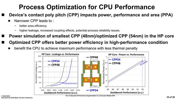次がプロセスの話で、C1-UltraについてCPP48とCPP54を比較したところ、密度という意味ではCPP54の方が高くできるのだが、同一リーク時の性能、あるいは同一周波数における消費電力ではCPP54の方が優秀で、CPP54を選択したとしている。