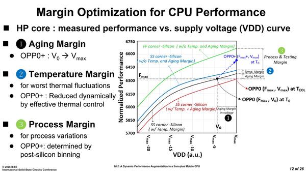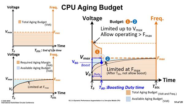 当然これは緩やかなカーブとなる。そこで、一時的にであるがVmaxを超える電圧をかけることで、より早く動作周波数がFmaxに到達するようになる。この一時的にVmaxを超えた分の電圧×時間(図中①)と、T0~TEOLの間のマージン分(図中②)を同じにする、ということで劣化の加速を抑えようという仕組みだ。