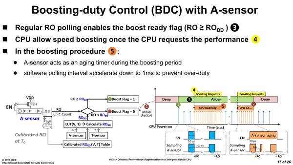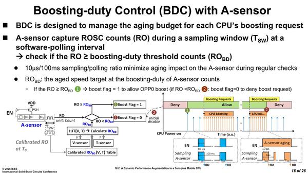 やっとDMPAに話が戻ってきた。DMPAはBDC(Boosting-Duty Control)とATC(hardware Adaptive Thermal Cooler)の2つから構成されるが、このうちBDCの仕組みを説明したのが下の画像だ。