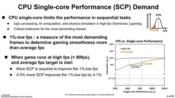 平均フレームレートから1%低い値というのが、おおむね9割近いフレームレートをカバーする範囲になる。これを80fps以上に引き上げるのが目的であり、SCP(Single Core Performance)を5%引き上げるとこの1%-Low fpsが4.1%向上するとしている