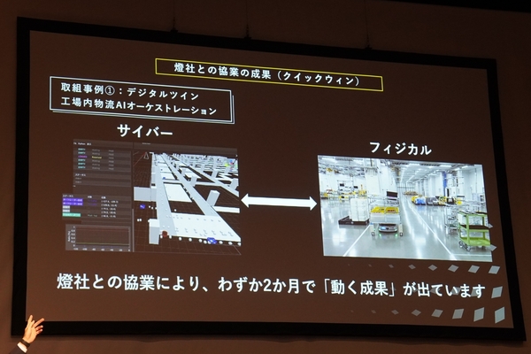 シミュレーションに基づくAIによる最適化の結果、自動搬送車の稼働率は5割改善。燈との協業開始からわずか2か月で、これだけの成果につながった。現在は、現場のエッジサーバーで処理しているが、最終的には自動搬送車を含む現場の機器にAIを直接埋め込み、自律分散的に協調させることを目指している。
