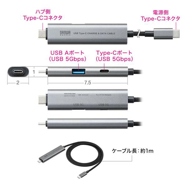 サンワサプライが運営する直販サイト『サンワダイレクト』は、新しい多機能USBハブ付き充電ケーブル「400-HUBC52BK(ブラック)」と「400-HUBC52S(シルバー)」を発売した。価格はどちらも2,164円(税抜)となっている。