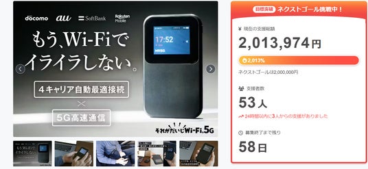 【支援額200万円突破】5G対応vSIM搭載の新世代モバイルWi-Fi「それがだいじWi-Fi 5G」がCAMPFIREにてネクストゴール達成