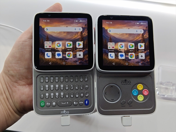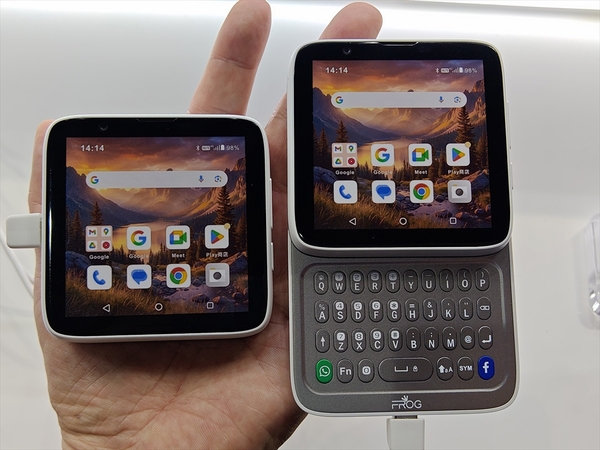 OEMやODMを手がけるFrog Mobileは、ほぼ正方形のディスプレーの裏側に回転式(スウェブル)でキーボードが現われるスマートフォンのモックアップを展示していた。同社自身が本製品を販売するのではなく、顧客からの受注に応じて生産をする。そのため市場に出てくるタイミングは不明。