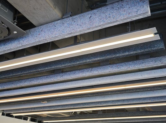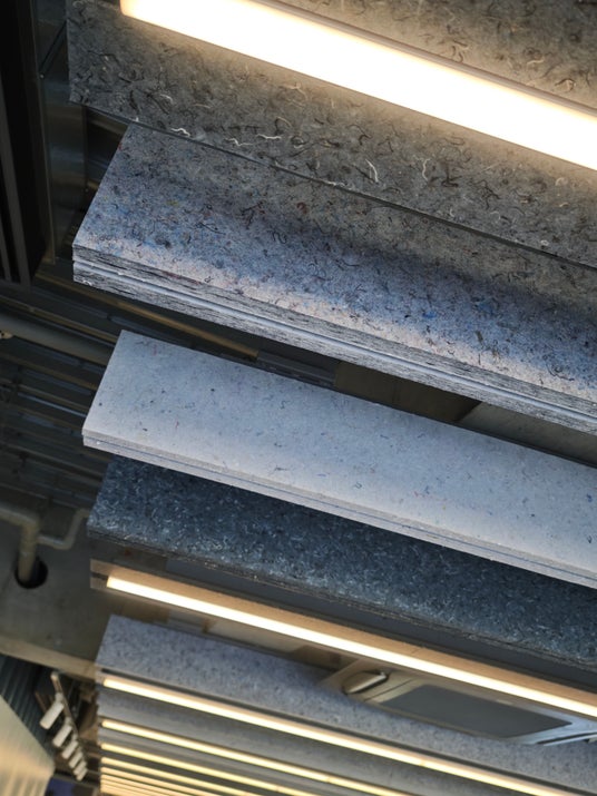 多様な人々が集まり、活発なワークショップや議論が行われるこの場所では、反響音を抑え、集中と対話を両立させる快適な音響設計が求められました。 今回採用された「Rebornfiber(R) Q-on」は、不用な古繊維を一度繊維状に戻して成形したリサイクル素材の吸音材です。