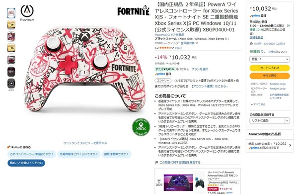Amazon.co.jpにて、PowerAのXboxワイヤレスコントローラー「XBGP0400-01」が販売中だ。参考価格は1万1700円だが、執筆時点では14%オフの1万32円で購入できる(3月19日時点)。