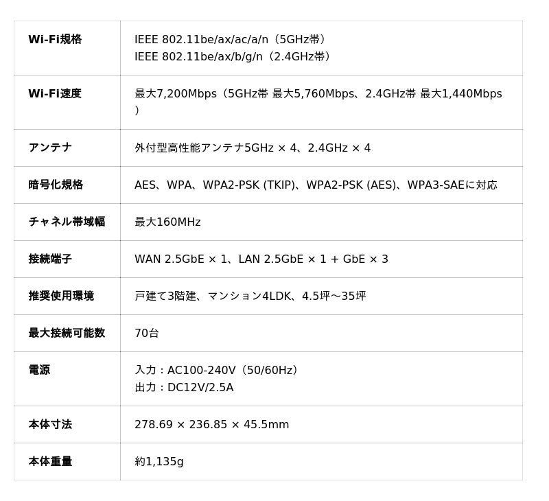 ●最新Wi-Fi 7規格対応、最大7.2Gbpsの超高速かつ安定した通信を実現