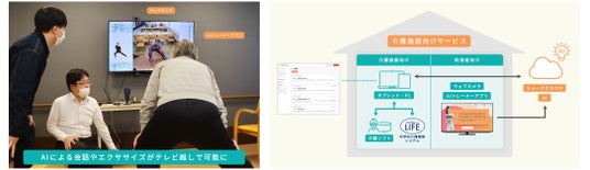左:機能訓練の実施イメージ、右:「介護向けAIトレーナー」構成イメージ