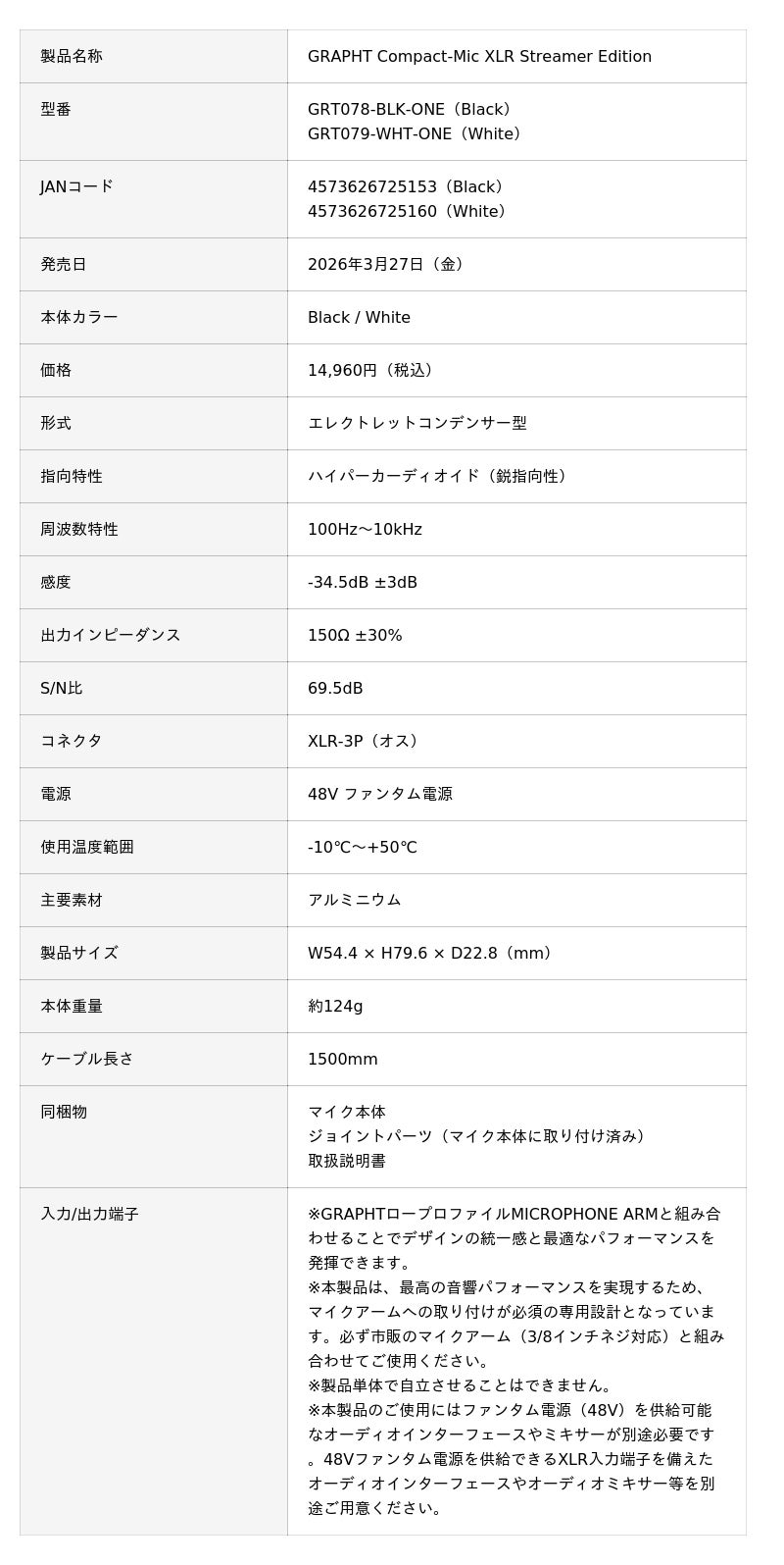 この度、毎日の当たり前をアップデートする『GRAPHT STANDARD』シリーズより、ストリーマーやゲーマーのデスク環境に特化した約60mmの超小型コンデンサーマイク『GRAPHT Compact-Mic XLR Streamer Edition』を2026年3月27日(金)にGRAPHT公式ECサイト(GRAPHT OFFICIAL STORE)および全国の家電量販店、PC専門店等で発売いたします。カラー展開は2色(Black / White)。同日より、GRAPHT ECサイトおよびAmazonでは、本製品とマイクアームのセット販売も実施いたします。