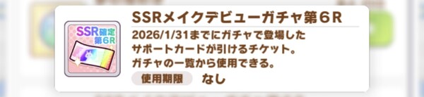 それを記念して、2026年4月19日23時59分までにゲームを開始したトレーナーを対象として、「SSRメイクデビューガチャ第6R」をプレゼントしている。これは2026年1月31日までに登場したSSRサポートカードが確定で出現するガチャチケットだ。ホーム画面の「プレゼント」から忘れずにゲットしておこう。