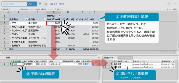 とはいえ、当初からこの形だったわけではなく、krewSheetのXrossモードを利用することで、ピボットテーブル感覚で各レコードを関連付けることで実現できた。「『これってマスタのレコードを関連付ければ、最新のデータがきちんと参照できるのでは?』と気がついたら、あとは早かったです」(大野氏)とのことで、納期回答を迅速に行なうために必要なレコードがうまくまとめられた。「基幹システムやExcelのデータがすべて集計された状態でまとまっているのが、このkintoneアプリの価値だと思います」と南崎氏は改めて絶賛する。
