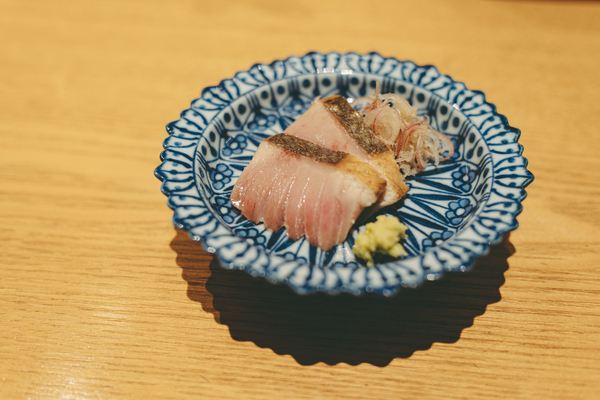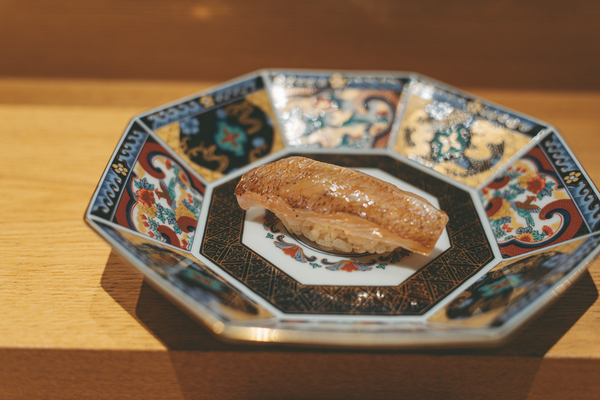 お寿司の前に、まずはつまみから。最初に登場したのは、あなごの稚魚「のれそれ」。透き通るような見た目で、つるりとした口当たりが印象的。ほんのりとした甘みがあり、春の訪れを感じる一皿です。お刺身の「めじまぐろ」は2〜3月に揚がる若いマグロで、皮ごと食べられるのが特徴だそう。藁焼きにすることで香ばしさが加わり、爽やかな脂の旨味がたまらない美味しさです。
