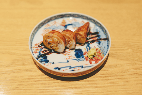 続いては「子持ちヤリイカ」。中にはゲソが詰められ、低温調理でふんわりと柔らかく仕上げられています。甘いタレとわさびの相性が抜群で、ふにっとした食感がクセになるおいしさ。思わずパクパクと食べ進めてしまいました。そして驚いたのが「ニタリ鯨」。豊洲でも入荷数が少ない希少な食材で、なんと10日間かけてゆっくり解凍することで肉質の柔らかさを保つのだそう。分厚く切られているのに驚くほど柔らかく、まるで上質な赤身肉のような口当たり。筋が残らないように切り方にも工夫されていて、まさに職人技の結晶でした。
