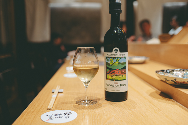 日本酒はもちろん、日本ワインも充実しているという「築地青空三代目 丸の内」。この日は山形の「ウッディーファーム&ワイナリー」のワインを仕入れているとのことで、白ワインを注文してみました。鼻に抜けるハーブやほのかなスパイスのニュアンスが心地よく、お寿司の旨みを引き立ててくれる一杯です。