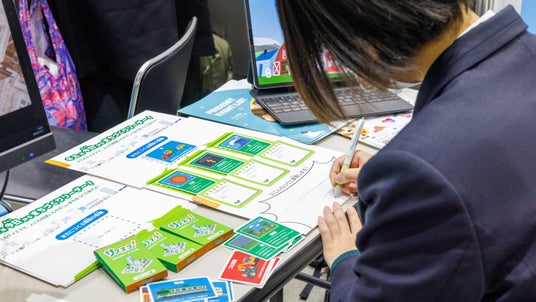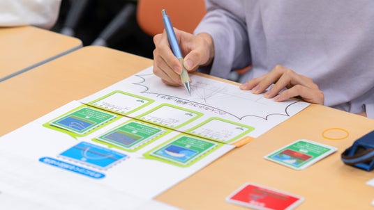 が描かれたカードを組み合わせ、専用のワークシートに沿って整理することで、知識差に左右されずアイデアを生み出せる仕組みです。ゲーム感覚で思考を広げることで、誰でもクリエイティブな解決策を提案できるようになります。