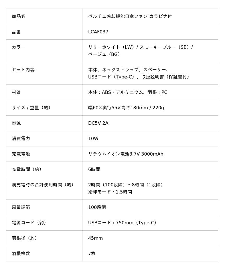 「ペルチェ冷却機能日傘ファン カラビナ付」LCAF037
