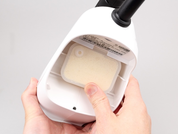 続いて給水タンクに水を入れます。給水タンクは本体から外れるタイプなので、重たい本体を持ち上げる必要も、ジョウゴを使って注ぎ入れる必要もありません。ゴムキャップを開けて、蛇口から直接入れるだけなので簡単です。